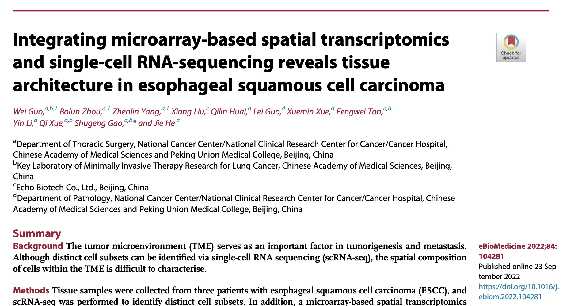 2022 年 9 月 23 日,柳叶刀子刊 eBioMedicine 刊登了关于食管鳞癌肿瘤微环境的最近进展,该项研究是由国家癌症中心/中国医学科学院肿瘤医院赫捷院士和高树庚教授组联合发表[2]。