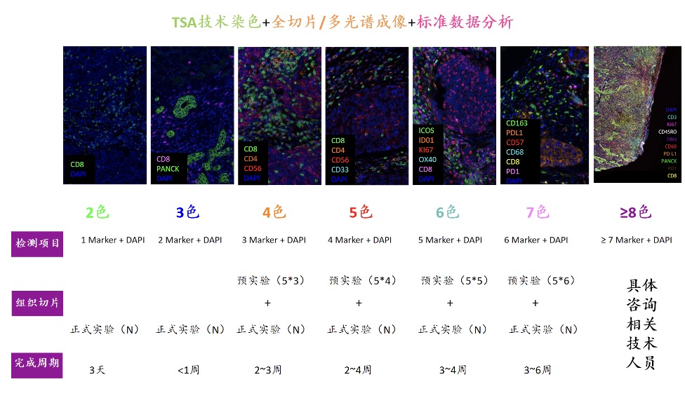 两篇文章都使用多重免疫组化(mIHC)技术对不同肿瘤的微环境中不同的细胞亚型进行了分析研究。mIHC基于 TSA(酪胺信号放大技术)染色原理,解除抗体种属限制,在一张样本上同时放大标记多种生物标志物,对不同类型的细胞进行定量统计,并在空间原位中刻画整个肿瘤免疫微环境。