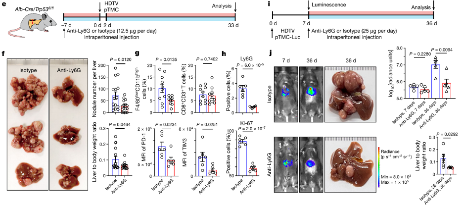 图4 Anti-Ly6G 抗体去除中性粒细胞可以有效缓解小鼠肝癌生长