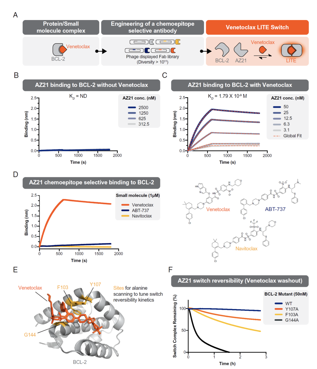 图2.可逆、依赖Venetoclax(简称V)的LITE开关设计及特征:A、V/BCL2复合物抗体筛选流程图;B、在没有Venetoclax的情况下,两者无结合;C、1uMVenetoclax存在的情况下,FabAZ21与BCL-2亲有效结合;D、小分子诱导结合具有特异性,其他小分子无法诱导结合;F、BCL-2突变体具有良好的可逆性。