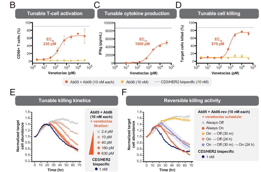 图4.Venetoclax调控双特异性T细胞激活:B、不同浓度Venetoclax激活T细胞的比例;C、不同浓度Venetoclax激活T细胞分泌IFNg检测;D、靶细胞杀伤情况;E、不同浓度Venetoclax加入导致对靶细胞的不同杀伤情况,Incucyte统计靶细胞死亡(红光荧光面积,归一化到0h)