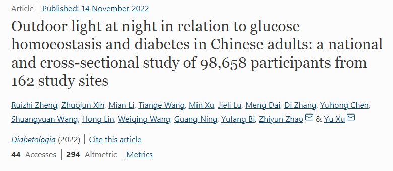 夜间暴露在人造光(LAN)下会破坏昼夜节律计时系统,可能会增加糖尿病的患病风险。上海交通大学通过对中国普通人群的全国性和横断面调查发现长期暴露于室外LAN与葡萄糖同源稳定标志物以及糖尿病患病率存在关联。