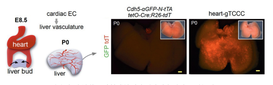 上图:邻近细胞遗传示踪技术追踪心脏内皮细胞向肝脏迁移。