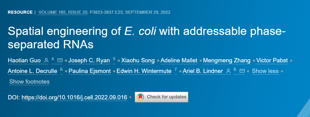 2022年9月29日,法国国家健康与医学研究院(INSERM)郭昊天博士和Ariel B. Lindner 教授等在《细胞》(Cell)杂志发表研究论文“Spatial engineering of E. coli with addressable phase-separated RNAs”。研究团队首次在细菌中人工合成细胞器——研究者采用了一种类似“搭积木”的模块化构建方法,研究所设计的核酸分子能够自组装成液态的亚细胞结构,并募集指定的蛋白质,进而形成各种具有预设功能的合成细胞器。