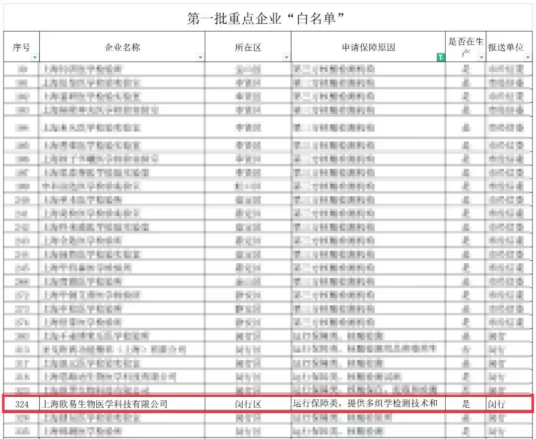 4月16日晚,上海市经信委出台了第一份“白名单”,准许666家企业在4月20日重新开工,获得开工的保障。欧易生物作为第一批被纳入666家重点企业“白名单”企业,封控期间仍坚守在生产一线,尽最大的努力,保障到样项目顺利进行。