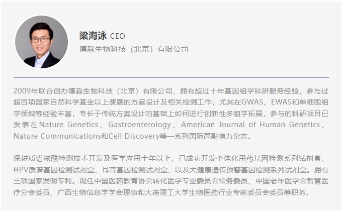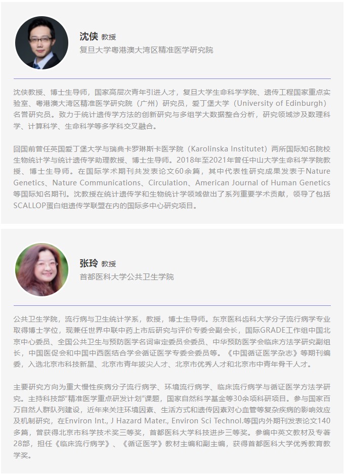 本次研讨会拟定于2023年1月12日周四下午线上举办,主题演讲内容将围绕基于健康及疾病人群队列, 以新一代血浆蛋白组学赋能多组学技术驱动的医学转化研究展开。本次会议有幸邀请到了遗传及群体基因组项目和队列研究领域的领军人物:复旦大学 沈侠教授、首都医科大学公共卫生学院 张玲教授、博淼生物科技CEO 梁海泳先生,共同探讨队列研究前瞻性框架设计、蛋白组学、多组学技术驱动的最新研究成果和转化应用新视角, 为进一步推动遗传与健康相关的大数据资源在疾病预防、临床诊断、健康预测等方面发挥更大价值。