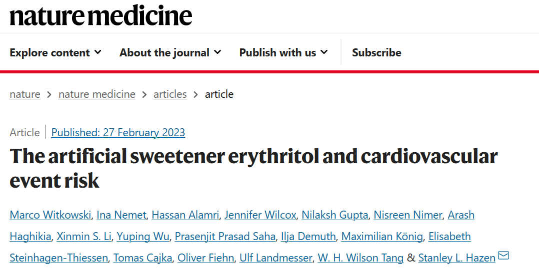 近日,克利夫兰诊所的研究人员在Nature Medicine上发表了题为“The artificial sweetener erythritol and cardiovascular event risk”的研究。该研究发现,现在流行的人造甜味剂——赤藓糖醇,与心脏病发作和中风的风险增加有关。