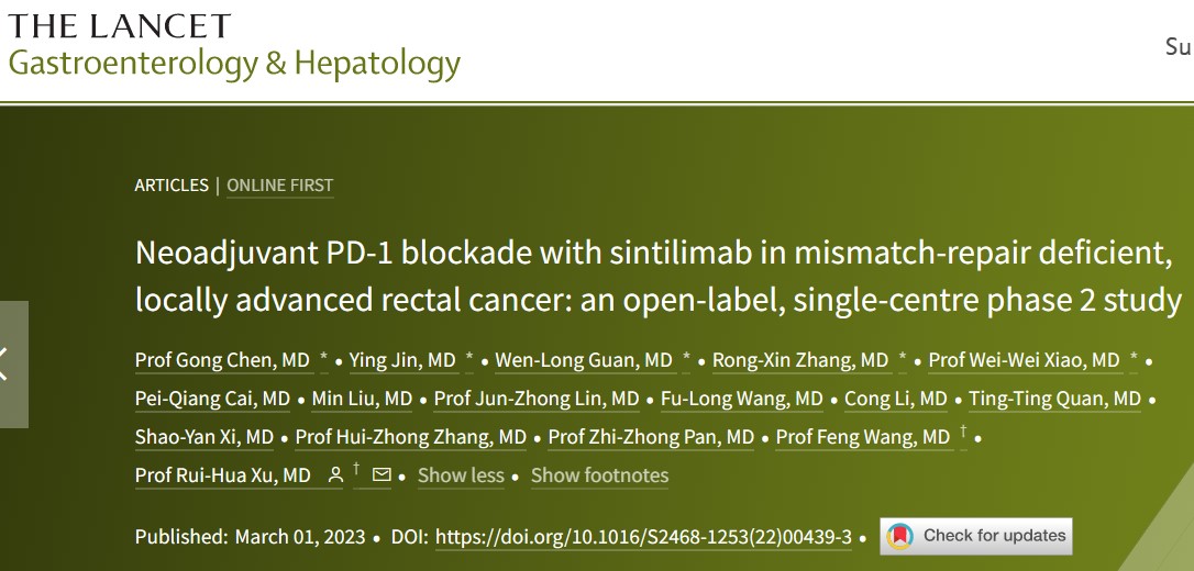 近日,中山大学肿瘤防治中心徐瑞华、王峰、陈功消化系统肿瘤团队在柳叶刀子刊《The Lancet Gastroenterology & Hepatology》在线发表了信迪利单抗用于错配修复缺陷的局部晚期直肠癌新辅助治疗的II期临床研究结果。该研究发现在错配修复缺陷(dMMR)或高度微卫星不稳定(MSI-H)局部晚期直肠癌中,通过程序性死亡蛋白-1(Programmed Death-1,PD-1)抗体治疗后,大部分患者能够达到临床完全缓解,避免放化疗及手术治疗的损伤。该结果为免疫治疗在错配修复缺陷或高度微卫星不稳定(dMMR/MSI-H)局部晚期直肠癌的应用提供了新的有力证据。