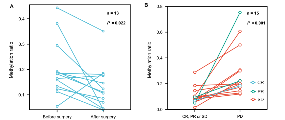 在一项前瞻性临床试验中,通过比较805名II-III期结直肠癌患者的术前血浆样本与术后血浆样本中的ctDNA甲基化标志物(WIF1 和 NPY),评估肿瘤复发的可能性。该研究发现ctDNA甲基化阴性组的2年无病生存率显着高于ctDNA甲基化阳性组(82% vs 64%),这表明ctDNA甲基化检测可用于术后的MRD检测[1]。