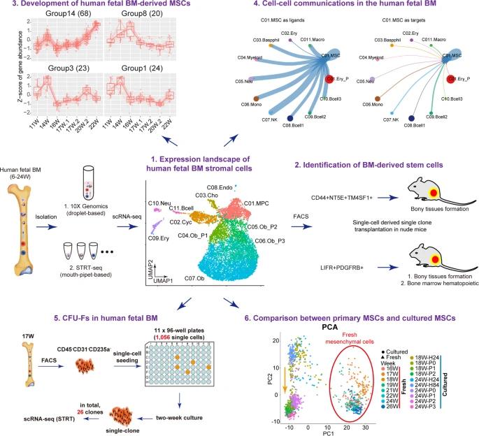 间充质干细胞研究的一个基本问题是,人类间充质干细胞在体内的真实身份尚未得到明确定义。在过去的几十年中,使用基因工程小鼠在定义和表征小鼠骨髓间充质干细胞方面取得了相当大的进展。此外,scRNA-seq技术帮助我们获得了对鼠BM中异质群体的全球认可。然而,由于材料限制,人类胎儿BM的细胞普查仍然被低估。在这项研究中,对超过10,000个人类胚胎单个BMNC进行了scRNA-seq分析,我们的细胞分析和功能分析不仅为这个问题提供了明确的答案,而且拓宽了我们对单细胞分辨率下人类胎儿BMSCs的异质性,发育,微环境的理解。