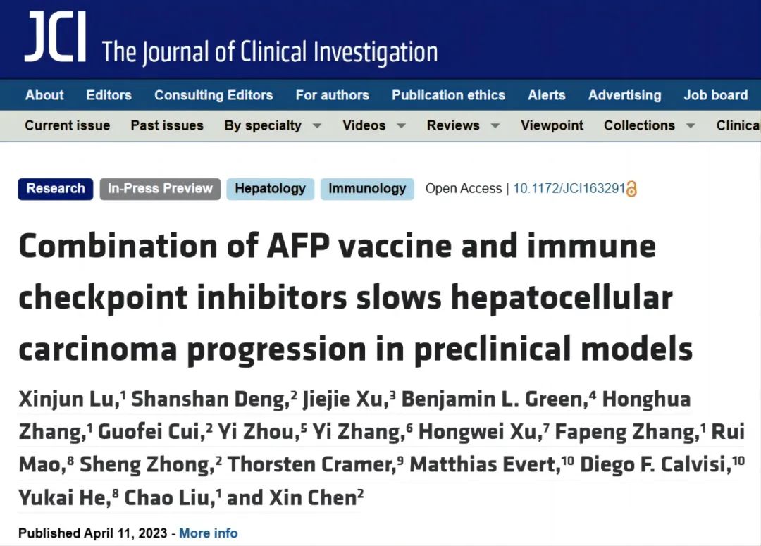 近日,中山大学刘超联合夏威夷大学陈昕在《Journal of Clinical Investigation》期刊上发表了一篇题为“Combination of AFP vaccine and immune checkpoint inhibitors slows hepatocellular carcinoma progression in preclinical models”的文章,该论文研究了HCC相关的自身/肿瘤抗原,基于α胎蛋白(AFP)的疫苗免疫用于治疗AFP (+)HCC小鼠模型。