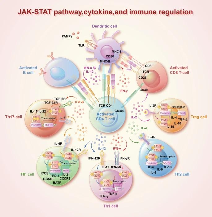 细胞因子对体液和细胞免疫反应至关重要。与自身免疫性疾病相关的多种细胞因子,包括IFN,IL和集落刺激因子,主要通过I型和II型细胞因子受体的组合发挥多效性作用。I型和II型细胞因子受体的相互作用可以激活JAK并随后募集STAT以转导来自细胞因子的信号。大量研究表明,细胞因子诱导的JAK-STAT通路激活在免疫细胞的分化和发育以及免疫系统的稳态中起着重要作用。