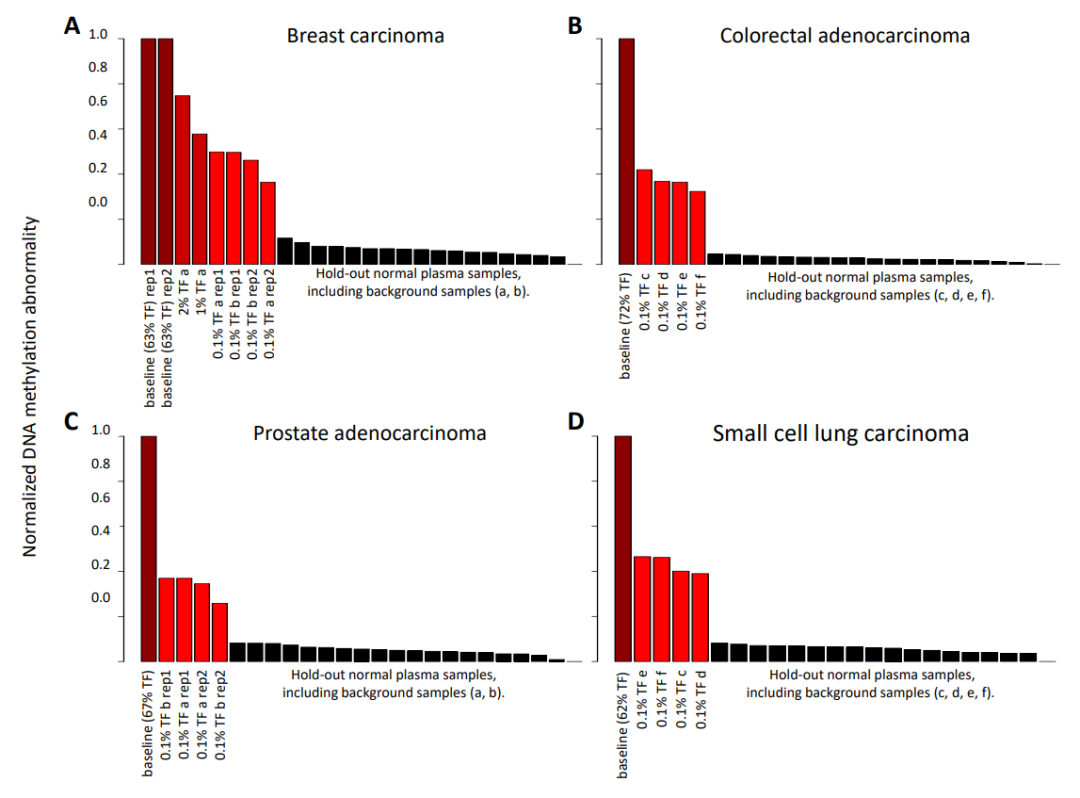 PredicineALERT™整合了DNA甲基化、突变和拷贝数变异分析技术,能够提供全基因组层面的DNA甲基化特征、肿瘤相关突变和染色体片段拷贝数变异信息,其中DNA甲基化检测对DNA片段保真性高,对样本需求量极低。在DNA样本需求方面,PredicineALERT™要求的input DNA量远远低于传统重亚硫酸盐甲基化测序要求的input DNA量(50ng),在input DNA量低至1ng时,PredicineALERT™方法得到的文库质量依旧能与全基因组重亚硫酸盐甲基化测序得到的文库质量保持较高的一致性,因而能广泛应用于各类液态活检样本与不同的临床检测场景。在不同肿瘤类型中,验证数据囊括了乳腺癌、结直肠腺癌、前列腺腺癌和小细胞肺癌等,肿瘤信号的检测灵敏性低至0.01%,可以广泛用于各类不同实体瘤患者的复发风险及药效监控。