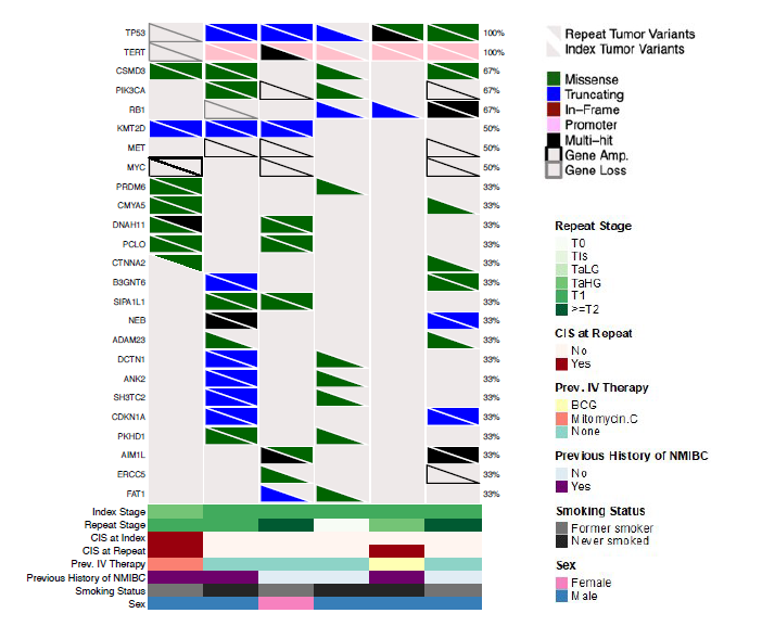 这项研究使用PredicineWES+™检测来自6例高危NMIBC患者首次TURBT术后的肿瘤样本(index)和行二次切除后的肿瘤样本中的突变。PredicineWES+™是慧渡医疗基于全外测序开发的一款既覆盖整个外显子区域同时又对600个肿瘤相关基因进行深度测序的检测产品。总体来看,高危NMIBC患者首次TURBT术后的肿瘤样本(index)和行二次切除后的肿瘤样本有519个突变是相同的,二次手术后的组织样本中检出的突变与index样本中检出的突变的一致率平均为83%,其中以TP53、TERT启动子、KMT2D、PIKC3A和RB1基因的突变最常见。