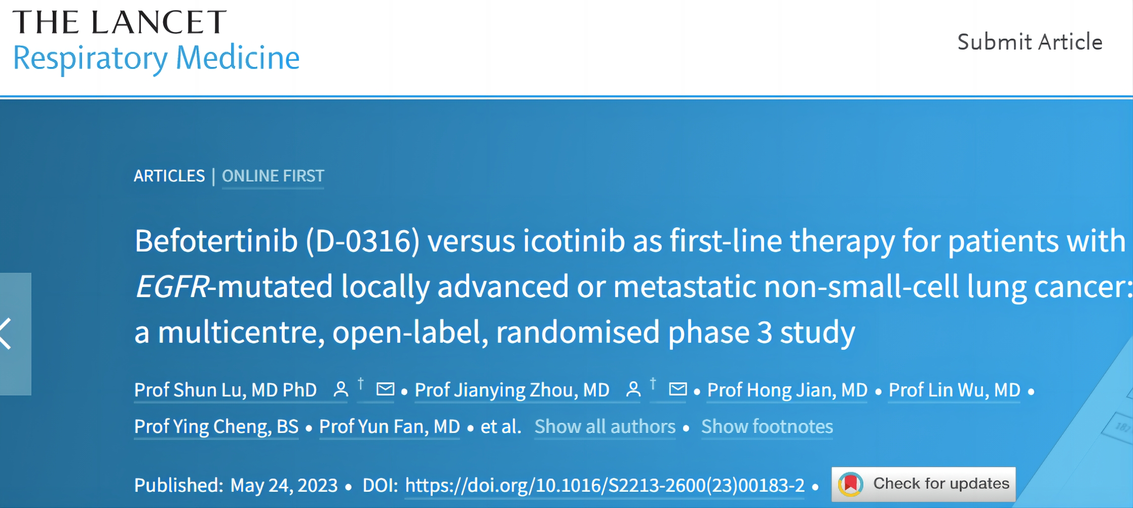 近日,上海交通大学陆舜和浙江大学周建英共同在国际知名期刊《Lancet Respiratory Medicine》上发表了题为“Befotertinib (D-0316) versus icotinib as first-line therapy for patients with EGFR-mutated locally advanced or metastatic non-small-cell lung cancer: a multicentre, open-label, randomised phase 3 study”的研究论文,该研究比较了贝福替尼与埃克替尼(icotinib)作为EGFR突变阳性的局部晚期或转移性非小细胞肺癌(NSCLC)患者一线治疗的疗效和安全性。研究结果表明,在EGFR突变阳性的NSCLC患者的一线治疗中,贝福替尼显示出优于埃克替尼的疗效。虽然贝福替尼组比埃克替尼组的严重不良事件更常见,但总体而言,贝福替尼组的安全性是可控的。