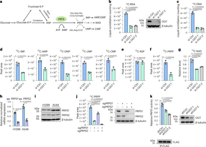 除了在核苷酸合成中的作用外,PRPP还充当NAD生产的中间产物。OGT的敲低降低了C标记的NAD产生,这表明OGT也在调节生物合成中发挥作用。