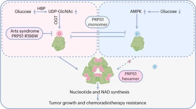 在目前的研究中,我们发现O-GlcNAc直接调节从头核苷酸的合成。在机制上,OGT介导的PRPS1丝氨酸83(S83)和苏氨酸166(T166)O-GlcNA酰化导致PRPS1六聚体形成并降低对PRPS1活性的反馈抑制,从而促进PRPS1活化、核苷酸合成和NAD产生。此外,PRPS1 O-GlcNA酰化促进肿瘤发生并影响癌细胞对化疗的反应。