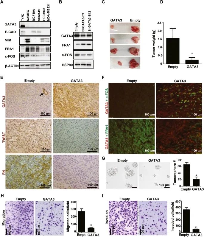 研究结果表明,在乳腺肿瘤细胞中,GATA3直接激活FOS的转录以维持其管腔和上皮特征,同时抑制FOSL1的转录以抑制异常的间充质分化,即抑制EMT。研究人员还证明了在GATA3缺陷的肿瘤起始和转移过程中,FRA1是EMT激活所必需的。