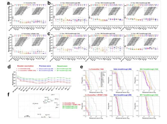 中和活性最高的是在中国最近的一波疫情中接种过BA.5或BF.7病毒并感染过的人,这可能是由于BA.5或BF.7病毒与新出现的病毒具有较高的抗原相似性,以及感染后采集样本的时间较短。仅加强疫苗接种组的大部分血清的中和抗体滴度低于我们的检测阈值,特别是BQ.1, BQ.1.1, CA.3.1, CH.1.1, XBB.1和XBB.1.5亚变体。然而,来自Omicron突破感染组的几乎所有血清的中和抗体滴度都高于我们的检测阈值,并且曲线的总体趋势向右移动进一步表明了增强的中和效力。综上所述,这些结果表明,在中国最近的疫情中接种疫苗后感染的人,至少在短时间内,应该对主要流行的SARS-CoV-2病毒具有中和活性。