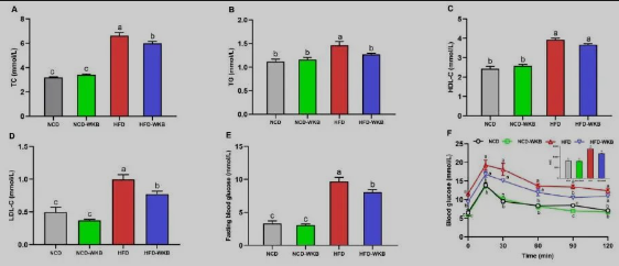 综上所述,补充WKB12周后,可有效减轻肥胖症状、血脂和葡萄糖,改善小鼠胰岛素抵抗和肝功能标志物,从而缓解肝脂肪变性。综合粪便微生物组和代谢组学分析进一步表明,WKB能够使HFD诱导的小鼠肠道生态失调正常化,从而介导多种代谢物的改变。特别是,WKB显著增加了益生菌(Akkermansiaceae,Bifidobacterceae和norank_f_Muribaculaceae)的相对丰度,并抑制了饮食诱导的肝脂肪变性小鼠中有害细菌(粘液螺旋菌,肠杆菌和Dubosiella)的生长。WKB改变的显著差异代谢产物在脂质代谢中被注释,可通过调节甘油磷脂代谢来改善肝脂肪变性。本研究从微生物组和代谢组学的角度阐明了WKB在预防非酒精性脂肪性肝病中的作用,为其在功能性食品中的应用提供了新的见解。(转化医学网360zhyx.com)