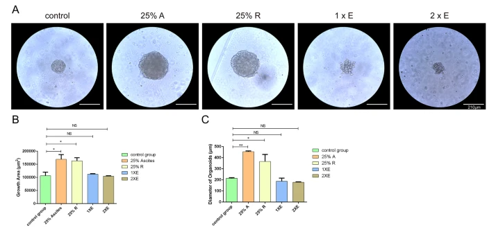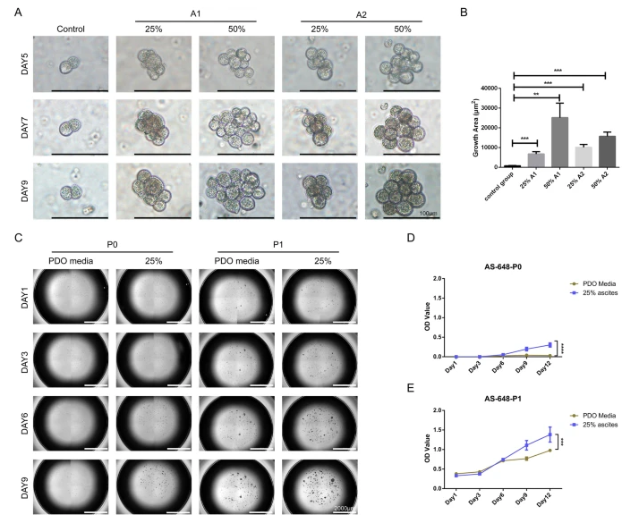 在优化MADO培养条件时发现的现象表明,目前的人工生态位不足以模拟EECs的微环境。我们首先需要弄清楚的是,EECs的生长促进作用是否具有特异性,即这种作用是否只存在于EECs和亲代腹水上清之间。通过交叉配对试验,我们发现亲本腹水上清液和非亲本腹水上清液都能促进MADOs的生长。此外,MA上清液对亚培养MADOs的生长也有很强的促进作用。总之,这些数据表明MA上清液对MADOs生长的促进作用是普遍的。我们注意到原代肿瘤细胞对MA上清液的依赖性高于亚培养的MADOs。这可能与原代肿瘤细胞和类器官结构的差异有关。