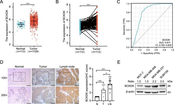 我们分析了TCGA乳腺癌RNA-seq数据集中BCAAs分解代谢酶的mRNA表达。我们发现与先前的研究一致的结果,BCAT,PP2C,BCKDK和KLF15在mRNA水平上存在显著差异。由于BCKDK对TNBC代谢和增殖的影响已在先前的研究中进行了研究,因此我们专注于研究BCKDK在乳腺癌细胞粘附和转移中的作用。BCKDK在预测肿瘤和正常结果方面表现出一定的预测准确性。为了确定BCKDK表达与乳腺癌组织中转移之间的关系,我们获得了10个肿瘤标本,匹配的邻近组织和腋窝淋巴结转移,并使用IHC评估BCKDK蛋白。淋巴结转移的BCKDK水平明显高于其BRCA原发,而相邻的正常组织是表达最低的组织。
