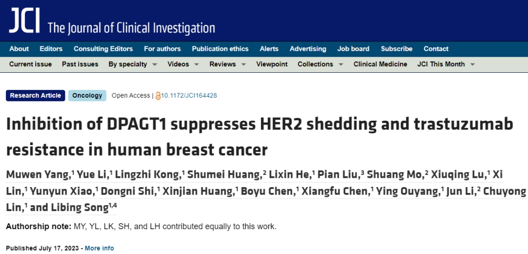 近日,中山大学研究人员在知名期刊《Journal of Clinical Investigation》上发表了题为“Inhibition of DPAGT1 suppresses HER2 shedding and trastuzumab resistance in human breast cancer”的研究论文,该研究发现抑制DPAGT1可抑制人乳腺癌中HER2的脱落和曲妥珠单抗耐药性。在曲妥珠单抗治疗后,膜结合的DPAGT1蛋白通过小泡途径内吞并逆行转运到内质网,DPAGT1诱导脱落酶- ADAM金属肽酶结构域10 (ADAM10)的N-糖基化,以确保其表达、成熟和激活。