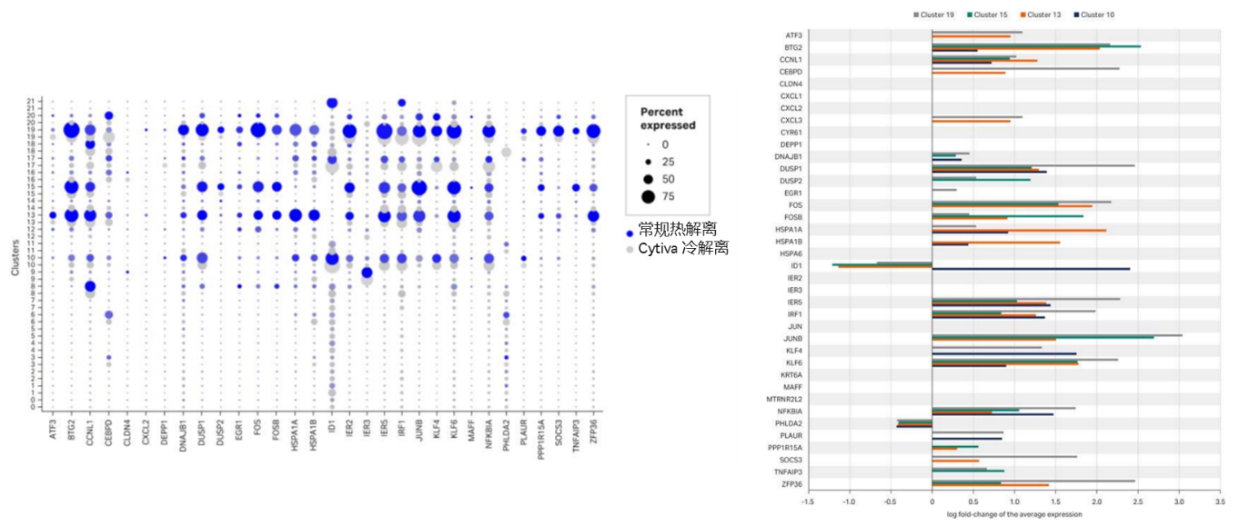 图5:Cytiva冷解离和常规热解离对细胞应激的影响。通过对应激标志物细胞簇10,13,15和19的表达水平分析,常规热解离对细胞的应激显著高于Cytiva低温解离试剂盒。