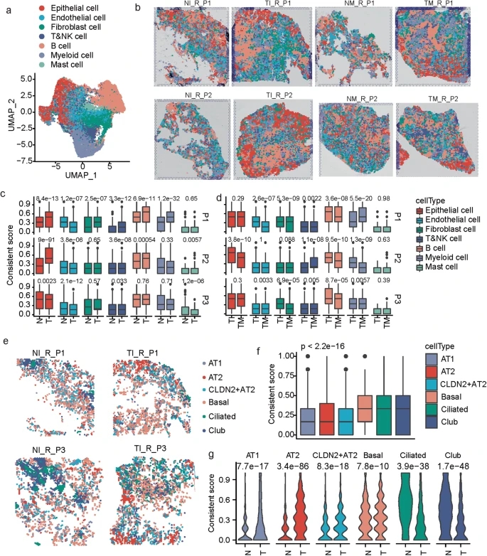 研究人员发现,来自同一MPLC患者的不同肿瘤在细胞组成和基因表达谱上彼此不同。此外,CNV分析表明,不同肿瘤病变内的恶性上皮细胞起源于不同的染色体变异,这为非同源进化作为MPLCs进展的决定因素提供了强有力的证据。通过与ST的整合,研究人员发现在同一患者的单独肿瘤病变中,多种细胞类型的空间组织是不同的。