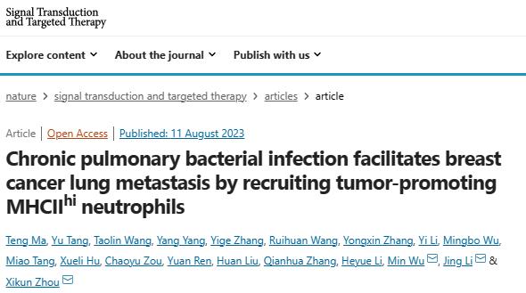 近日,中国科学院大学研究团队与川大华西医院研究团队在《Signal Transduction and Targeted Therapy》上发表题为“Chronic pulmonary bacterial infection facilitates breast cancer lung metastasis by recruiting tumor-promoting MHCIIhi neutrophils”的研究报告。在本研究中,研究人员使用的小鼠模型表明,慢性肺部细菌感染通过将一种具有促癌特性的肿瘤浸润MHCIIhi中性粒细胞亚型招募到肺部来增强乳腺癌的肺转移。功能上,MHCIIhi中性粒细胞通过细胞内在途径促进乳腺癌肺转移。此外,研究人员发现肺组织中的CCL2是招募和维持MHCIIhi中性粒细胞的重要环境信号。研究结果清楚地将细菌-免疫交互作用与乳腺癌肺转移联系起来,并确定MHCIIhi中性粒细胞是慢性感染和肿瘤转移之间的主要中介。