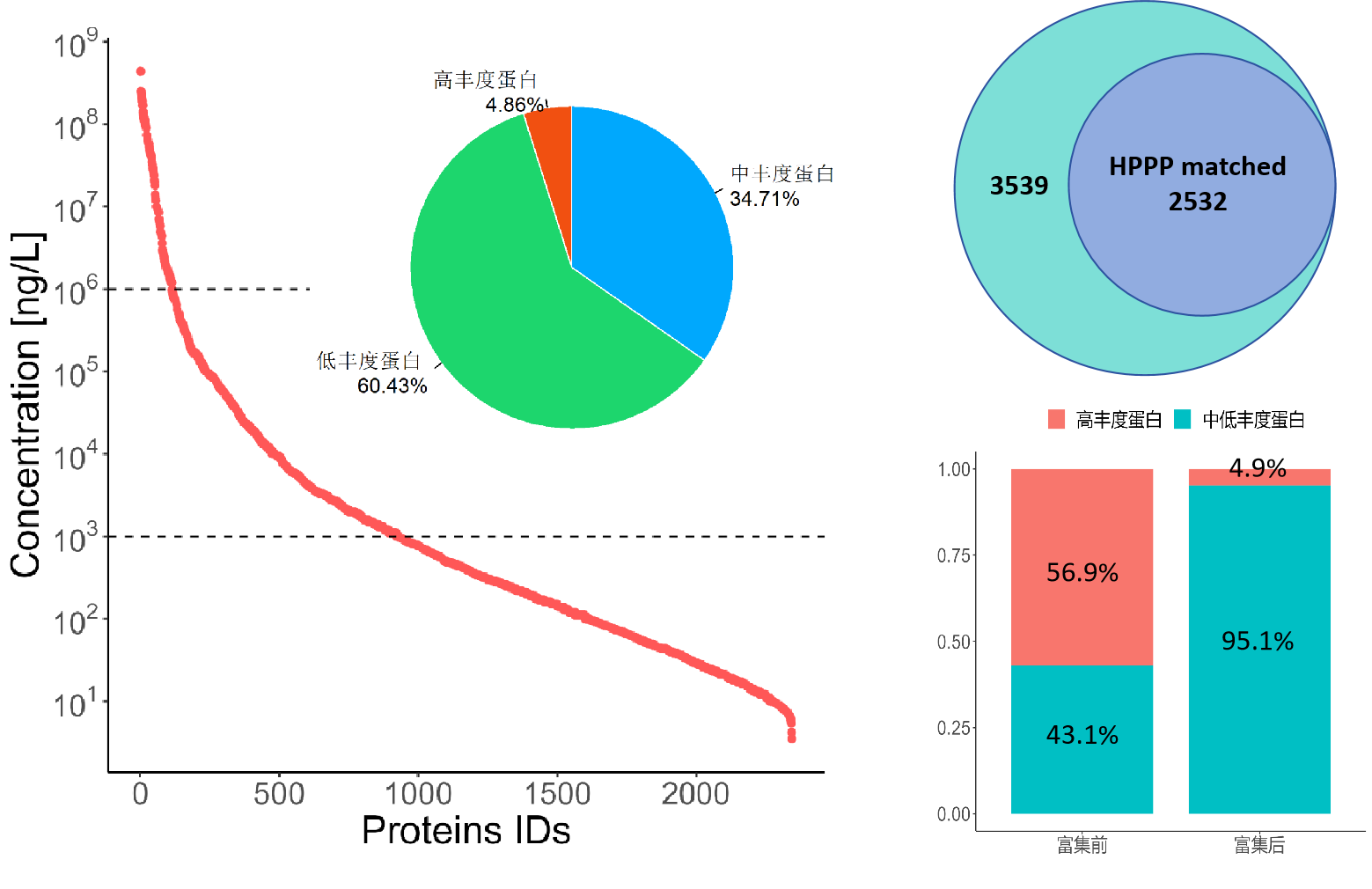 这些蛋白质与人类血浆蛋白质组计划(HPPP)数据库匹配的有2532个,新鉴定到3539个。与HPPP匹配的2532个蛋白的动态范围跨越9个数量级,中低丰度蛋白从富集前的176个提升富集后的2231个,提升了近13倍。