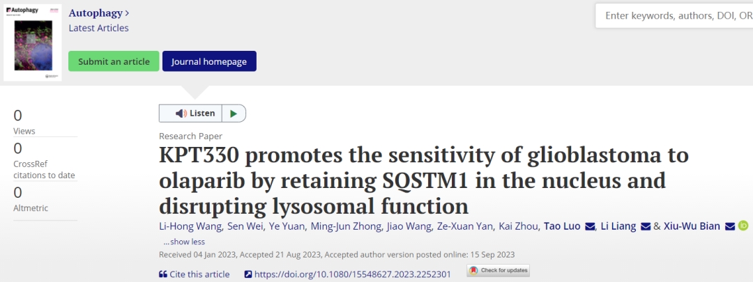 9月15日,陆军军医大学卞修武院士,罗涛和南方医科大学梁莉共同在期刊《Autophagy》发表了题为“KPT330 promotes the sensitivity of glioblastoma to olaparib by retaining SQSTM1 in the nucleus and disrupting lysosomal function”的研究论文,该研究揭示了 PARP 抑制剂奥拉帕尼(olaparib)和 XPO1(exportin 1)抑制剂 KPT330 联合治疗对 GBM 细胞显示出协同的抗癌效果。