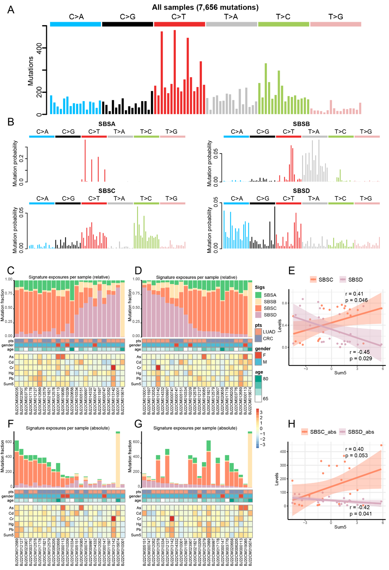 接下来,本研究利用Sigfit(R package)对NGS测序结果进行snv突变特征的提取。固定COSMIC Signature 1(SBSA),同时提取其他三个特征(SBSB/SBSC/SBSD)。通过与已知的COSMIC突变特征比对,SBSB、SBSC和SBSD分别与 COSMIC SBS22(相似度0.75), SBS5(相似度0.90), 和SBS40(相似度0.85)具有最高的相似性(图2A-B)。接着,本研究分析了这些突变特征和有毒重金属元素之间的相关性,发现SBSC(与SBS5相似性最高)与元素的总暴露正相关(突变特征相对值r=0.41, p=0.046;突变特征绝对值r=0.40, p=0.053),而SBSD(与SBS40相似性最高)与元素的总暴露负相关(突变特征相对值r=-0.45, p=0.029;突变特征绝对值r=-0.42, p=0.041;图2C-H)。