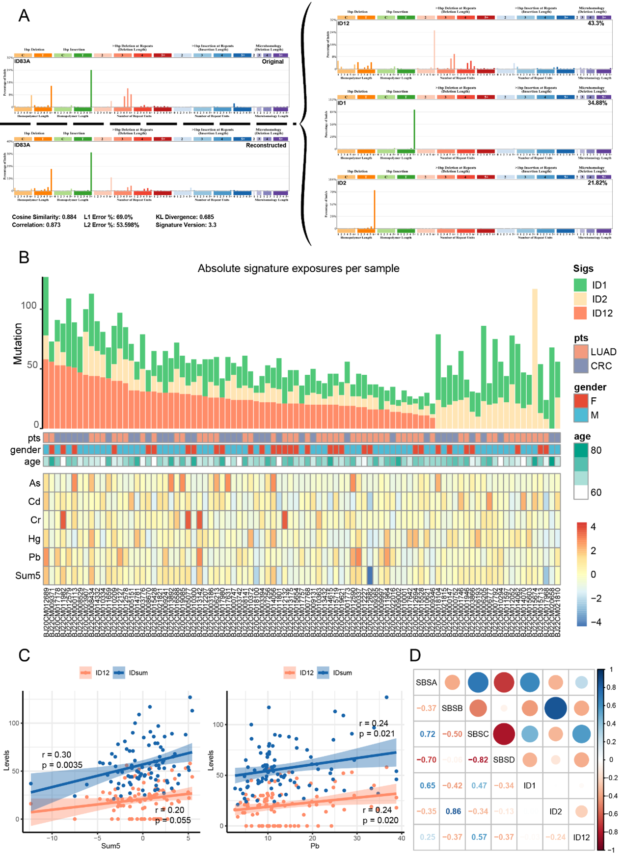 类似地,本研究利用SigProfilerExtractor(Python模块)对NGS测序结果进行indel突变特征的提取。结果发现,三个已知的COSMIC indel突变特征ID1、ID2和ID12在突变图谱中占主导(图3A),而ID12与Pb水平以及五种元素的总体水平之间存在正相关关系(Pb r=0.24, p=0.021; 总体水平 r=0.30, p=0.0035; 图3B-C)。