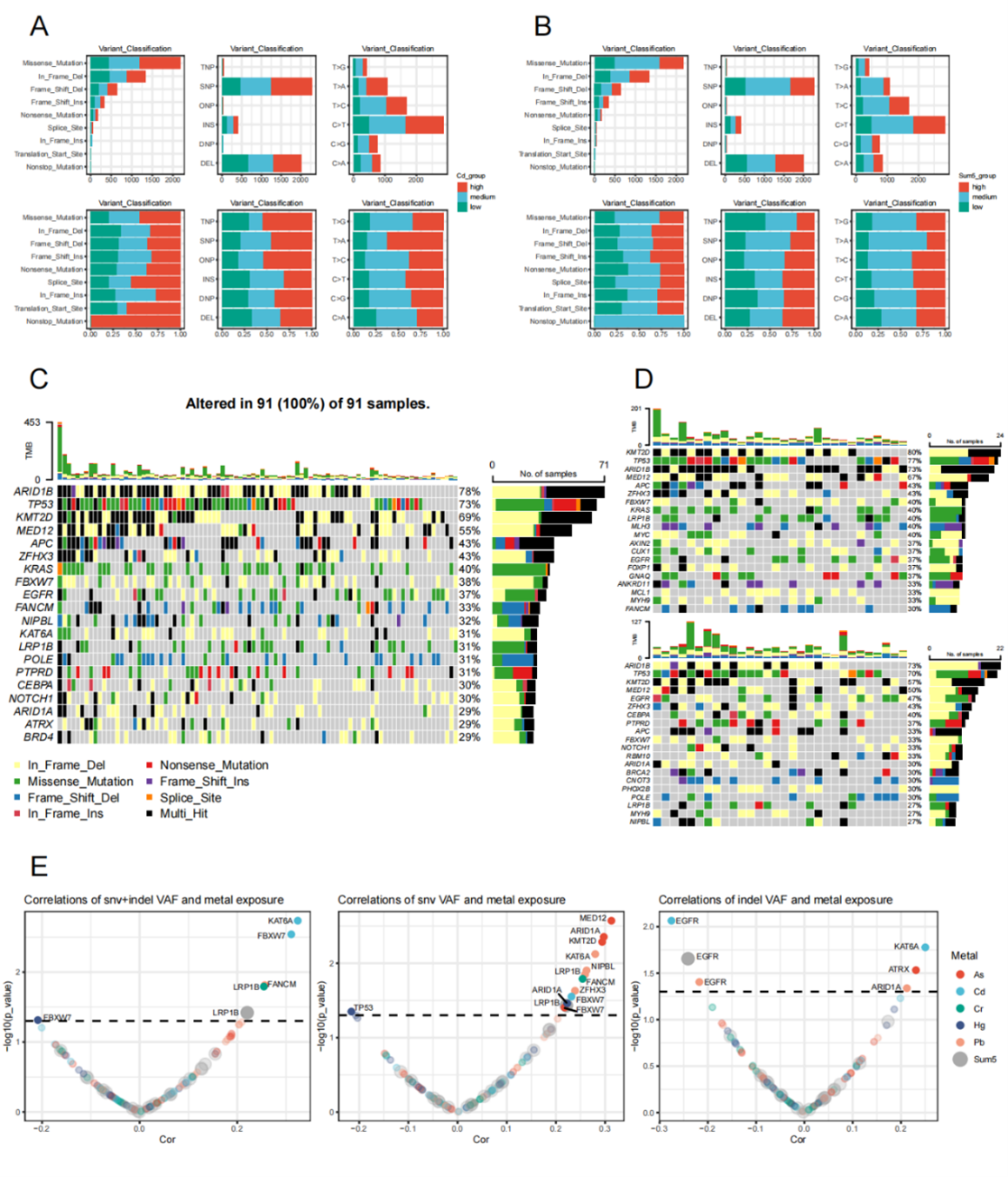 最后,本研究进一步探讨了不同突变类型以及高频突变基因的等位突变频率(VAF)与金属元素暴露之间的关系。在Cd“低”水平组中,各种变异类型的数量远低于“中”和“高”水平组,包括错义突变、剪切位点、SNP、ONP(寡核苷酸多态性)和所有六种单核苷酸变异类型(图4A)。