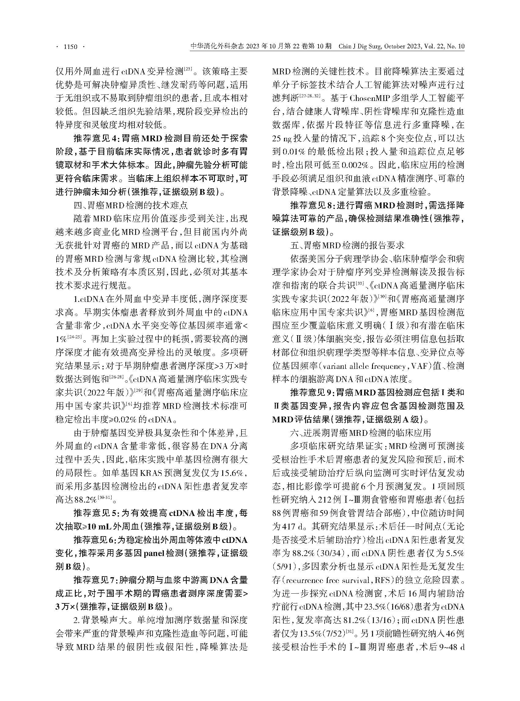 推荐意见 10:进展期胃癌在根治性手术后或术后首次随访时,可考虑行 MRD 检测;若接受辅助治疗则建议在治疗前接受 MRD 检测,有助于判断预后和制订进一步的治疗随访策略(强推荐,证据级别B级)。