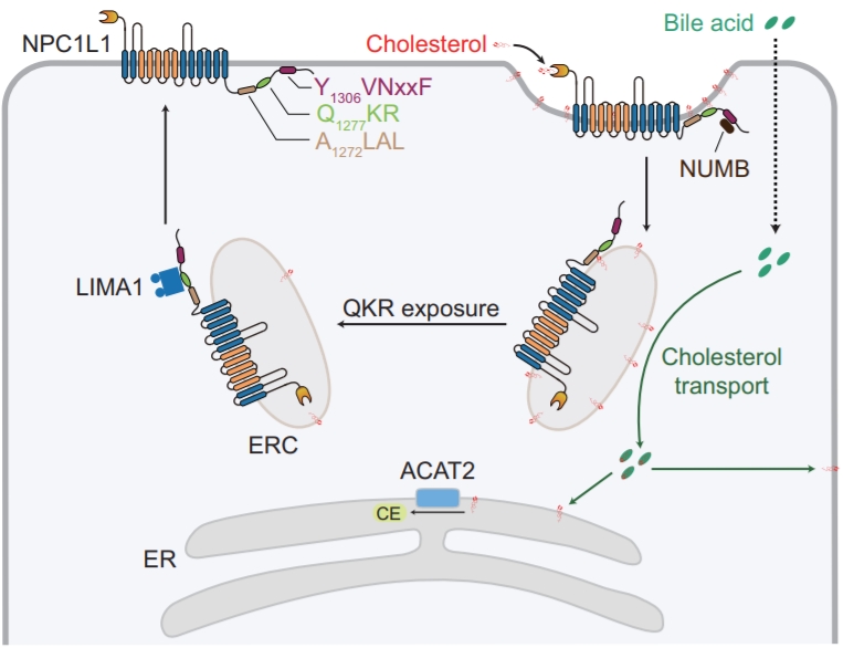 Niemann-Pick C1 like 1 (NPC1L1)是一种13-跨膜蛋白,是肠道吸收胆固醇所必需的。之前的研究表明,NPC1L1通过囊泡内吞作用吸收膳食胆固醇。胆固醇与NPC1L1的氨基端结合诱导羧基端与质膜(PM)分离,暴露出内吞基体Y1306VNxxF(其中x代表任意氨基酸)以供NUMB识别。NUMB招募AP2/网格蛋白生成网格蛋白包被的囊泡并启动NPC1L1内吞作用。同时,NPC1L1与flotilin -1/−2相互作用形成富含胆固醇的膜微域。通过这种囊泡运输方式,NPC1L1将大量胆固醇运输到内噬循环室(ERC), ERC是一种富含胆固醇的rab11阳性核内体,被认为是细胞内胆固醇库。当ERC中的胆固醇水平下降时,NPC1L1通过其Q1277KR残基与LIM结构域和肌动蛋白结合1 (LIMA1)相互作用,并由LIMA1和相关的肌球蛋白Vb再循环到PM。突变导致细胞内NPC1L1滞留,降低肠道胆固醇吸收。依折麦布通过结合NPC1L1并抑制其内化来阻断胆固醇的吸收。
