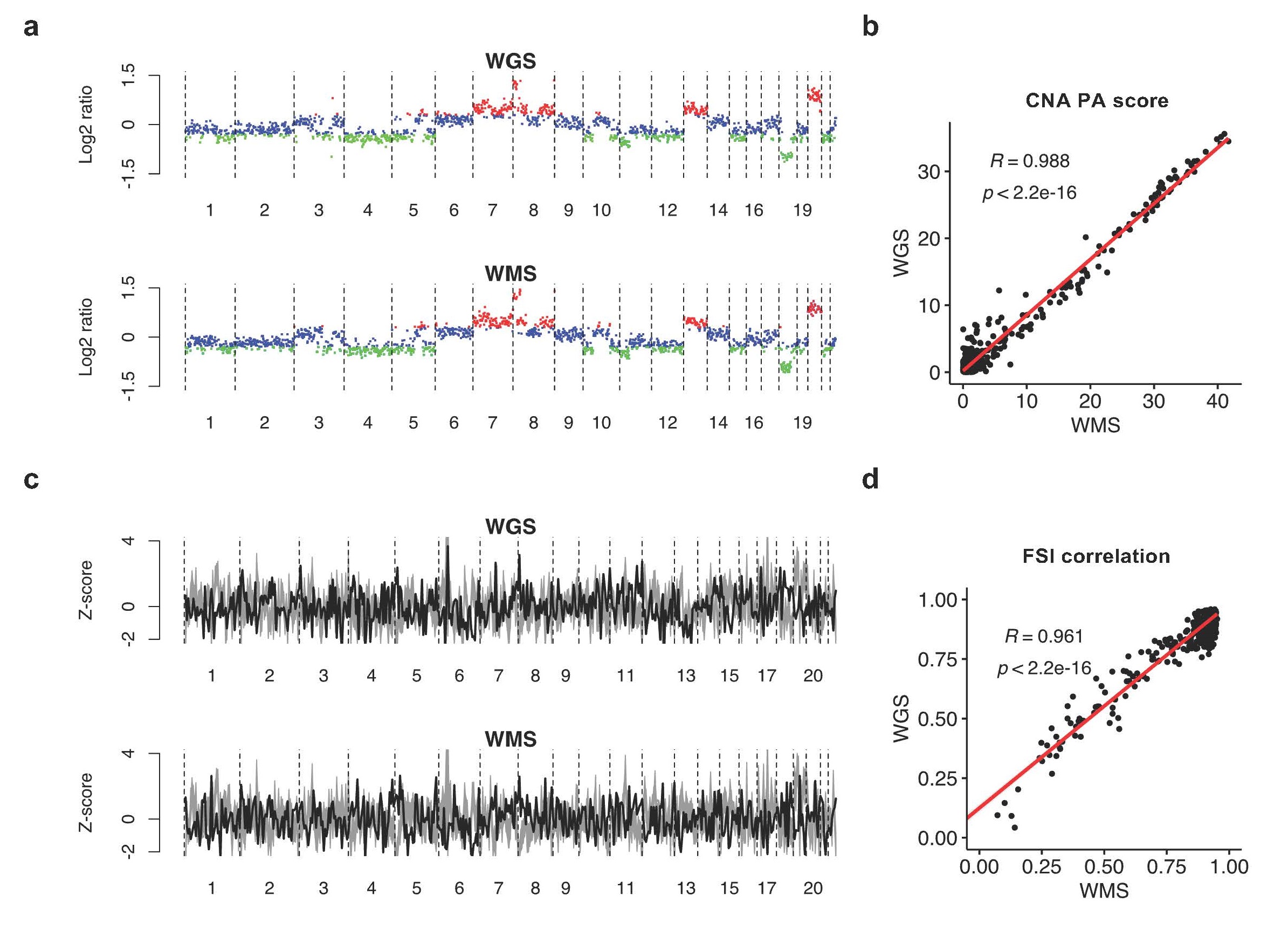 利用512例平行血浆样本对WMS和“金标准”全基因组测序(WGS)平台进行技术比较,发现血浆的拷贝数变异(CNA;相关系数:0.988)和片段化特征(FSI;相关系数:0.961)在两个平台高度一致(图2),证明WMS平台可适用于拷贝数和片段组学等维度的分析。