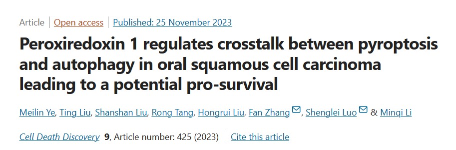 11月25日,山东大学齐鲁医学院研究团队在期刊《Cell Death Discovery》上在线发表题为“Peroxiredoxin 1 regulates crosstalk between pyroptosis and autophagy in oral squamous cell carcinoma leading to a potential pro-survival”的研究论文,研究阐明了Prdx1过表达在口腔鳞状细胞癌(OSCC)发展中的关键作用。研究人员证明,在OSCC细胞中,内源性Prdx1的沉黙通过ROS独立机制抑制自噬,通过ROS依赖机制促进火凋亡,并参与自噬和火凋亡之间错综复杂的相互作用。研究结果揭示了Prdx1作为治疗口腔鳞状细胞癌患者的潜在治疗靶点。