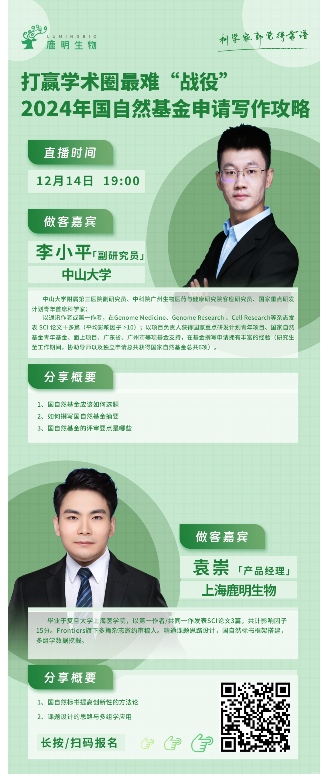本期小鹿特邀以项目负责人获得国家重点研发计划青年项目、国家自然基金青年基金、面上项目、广东省、广州市等项基金支持,在基金撰写申请拥有丰富的经验(工作期间,协助导师以及独立申请总共获得国家自然基金总共6项)的来自中山大学附属第三医院李小平副研究员和鹿明生物产品经理袁崇于2023年12月14日 19:00做客鹿明生物直播间分享《国家自然基金申请选题、写作心得》,探讨2024年国自然基金申请写作攻略,期待与您直播间不见不散~