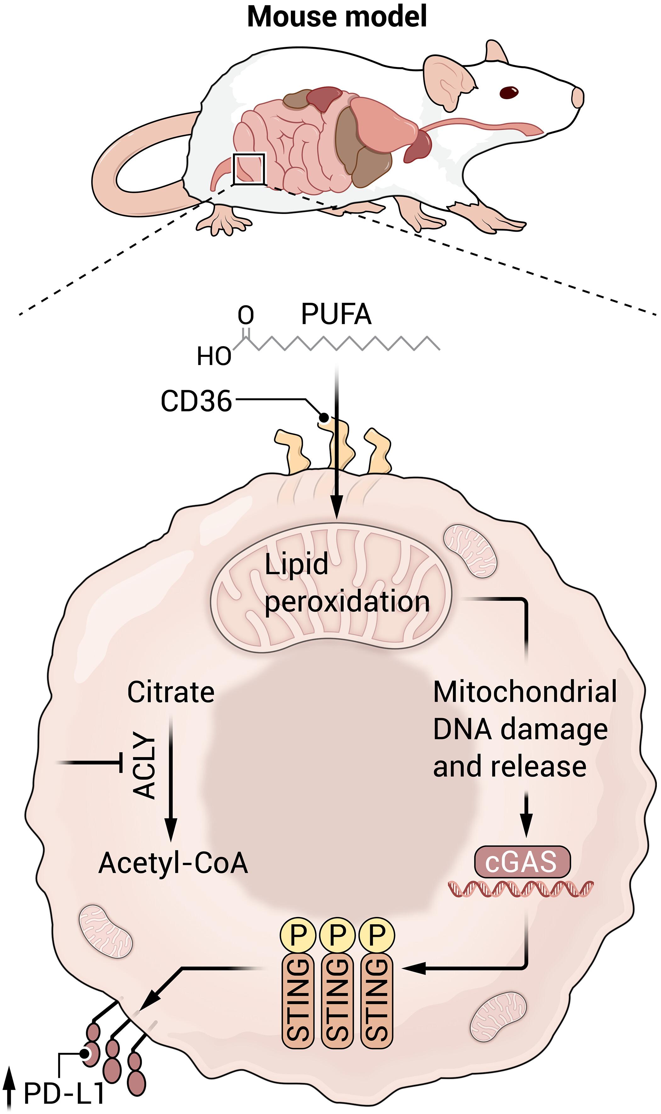 抑制ACLY是一种关键的代谢酶,可对肿瘤细胞进行重编程,以消耗外源性多不饱和脂肪酸(PUFAs)。脂肪酸氧化可以促进线粒体DNA的损伤和释放,进而触发cGAS STING通路,诱导肿瘤细胞表面的PD-L1蛋白。在免疫治疗耐药的肿瘤中,将 ACLY 抑制(或膳食 PUFA 干预)与免疫检查点分子 (ICM) 阻断相结合可以重振肿瘤靶向 T 细胞。插图来源:Austin Fisher/Science Advances。