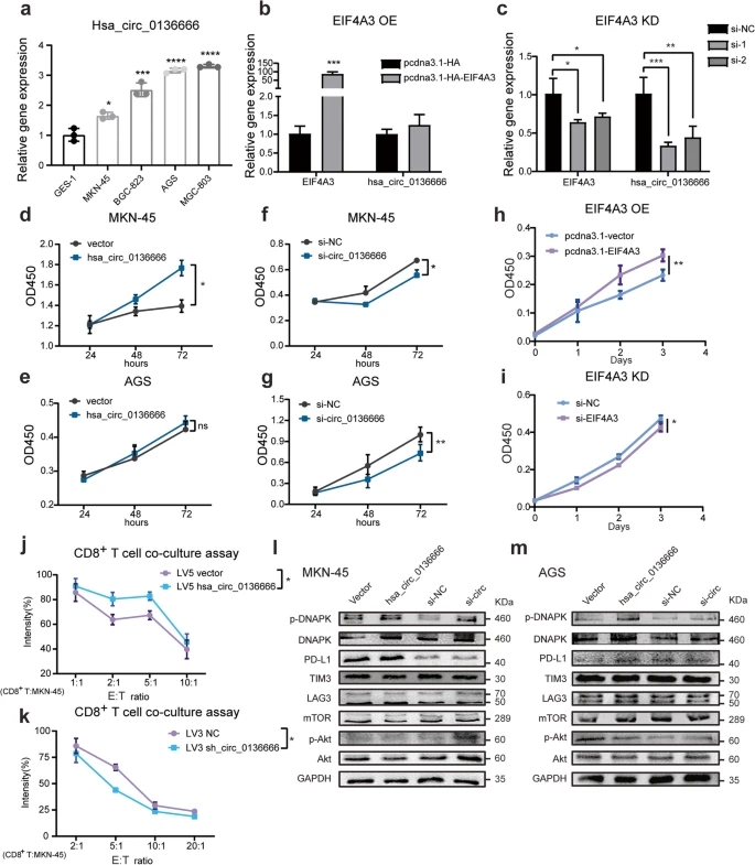 CCK-8实验发现hsa_circ_0136666过表达促进癌细胞增殖,而使用siRNA敲低hsa_circ_0136666导致细胞生长抑制。hsa_circ_0136666在肿瘤生长中至关重要。研究人员还注意到,EIF4A3的存在持续促进胃癌细胞的生长速度。相反,随着EIF4A3的敲低,细胞生长速度被抑制。