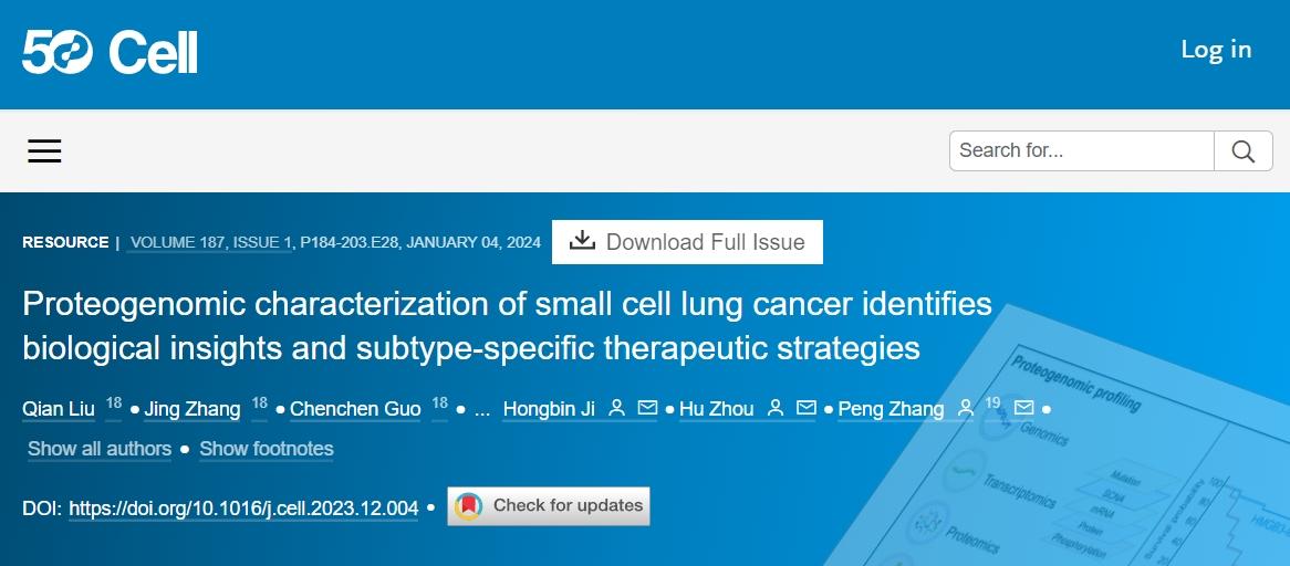 2024年1月4日,同济大学医学院/附属上海市肺科医院张鹏教授团队、中国科学院上海药物研究所周虎研究员团队与中国科学院分子细胞科学卓越创新中心季红斌研究员团队、高大明研究员团队合作在国际顶级学术期刊《Cell》在线发表题为“Proteogenomic characterization of small cell lung cancer identifies biological insights and subtype-specific therapeutic strategies”的研究论文,首次在国际上大规模表征小细胞肺癌的蛋白组学图谱,为小细胞肺癌个性化治疗带来福音。
