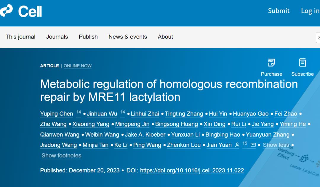 2023年12月20日,上海同济大学医学院/附属东方医院袁健教授课题组在《Cell》上发表了题为“Metabolic Regulation of Homologous Recombination Repair by MRE11 Lactylation”的研究成果,研究揭示了蛋白乳酸化修饰链接肿瘤代谢与DNA损伤修复的关键分子机制,并提供了潜在的肿瘤治疗靶点与策略。