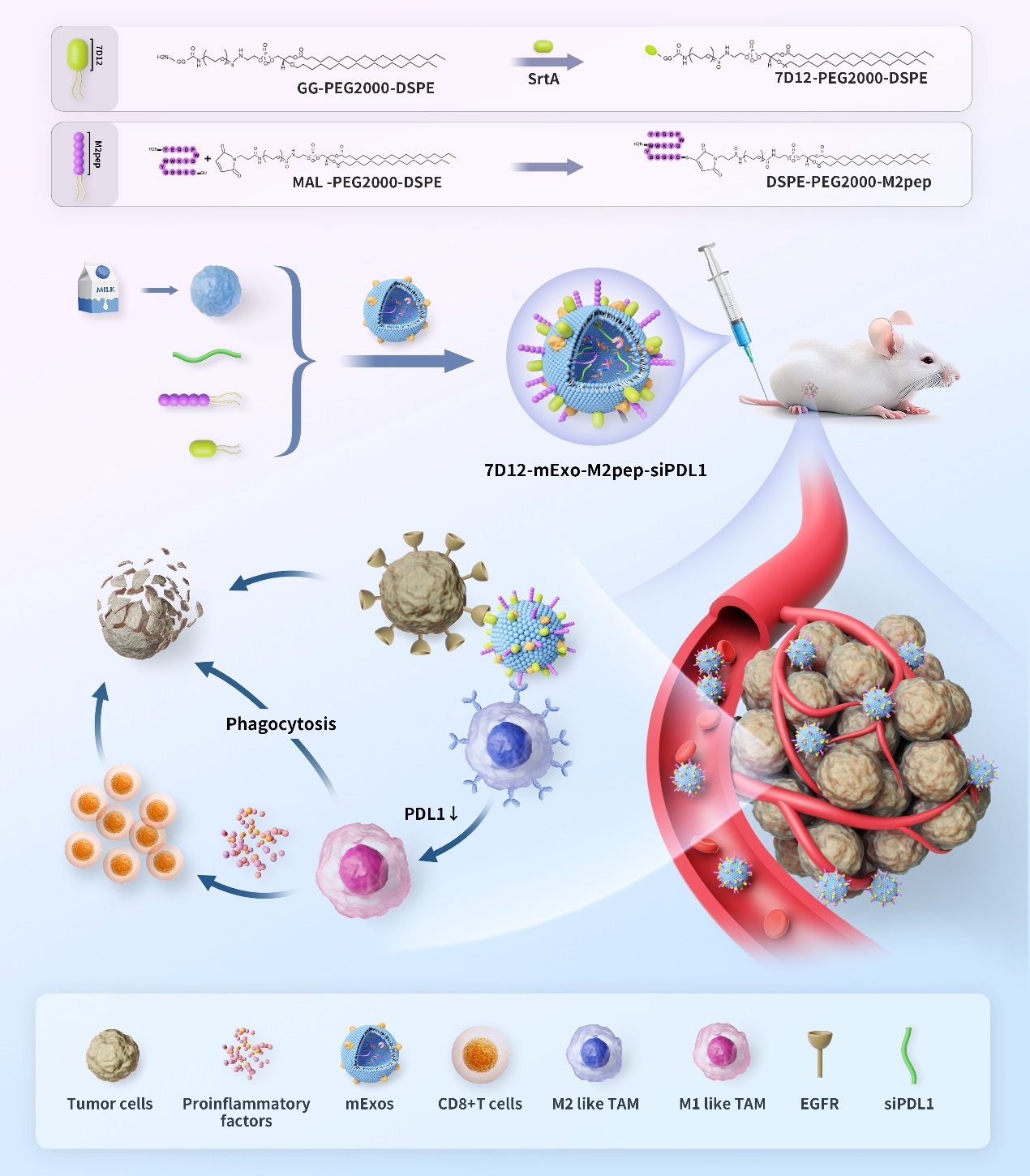 近日,江南大学附属医院黄朝晖研究团队在国际权威期刊《Journal of Controlled Release》上发表题为“Reprogramming tumor-associated macrophages by a dually targeted milk exosome system as a potent monotherapy for cancer”的研究成果。该研究开发了一种用M2pep (M2型巨噬细胞结合肽)和7D12(抗EGFR纳米抗体)修饰的工程化牛奶外泌体(milk exosome, mExo)系统(7D12-mExo-M2pep-siPDL1),以特异地将siPDL1递送到M2型TAM中,诱导其重编程为M1巨噬细胞,重塑肿瘤微环境(TME)。荷瘤小鼠治疗实验结果显示,该工程化mExo静脉给药后,显示了优异的单药抗肿瘤活性,提示该肿瘤免疫治疗新策略具有潜在的临床应用前景。
