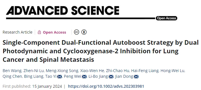 1月15日,复旦大学董健研究团队在期刊《Advanced Science》上发表了题为“Single-Component Dual-Functional Autoboost Strategy by Dual Photodynamic and Cyclooxygenase-2 Inhibition for Lung Cancer and Spinal Metastasis”的研究论文,本文报道了一种单组分双功能前药策略,用于肿瘤微环境(TME)产生的HOCl特异性激活的肿瘤治疗。研究人员构建了具有代表性的前药DHU-CBA2。DHU-CBA2对HOCl具有较高的敏感性,在体外和体内可实现双药同时释放。DHU-CBA2通过PDT和环氧化酶-2 (COX-2)抑制作用对肺癌和脊柱转移具有有效的抗肿瘤活性。DHU-CBA2促进CD8+ T细胞的浸润和功能,从而诱导强大的抗肿瘤免疫反应。本工作为TME特异性HOCl激活的单组分双功能前药提供了一种自增强策略,从而通过PDT和COX-2抑制剂的协同治疗实现良好的肿瘤治疗效果。