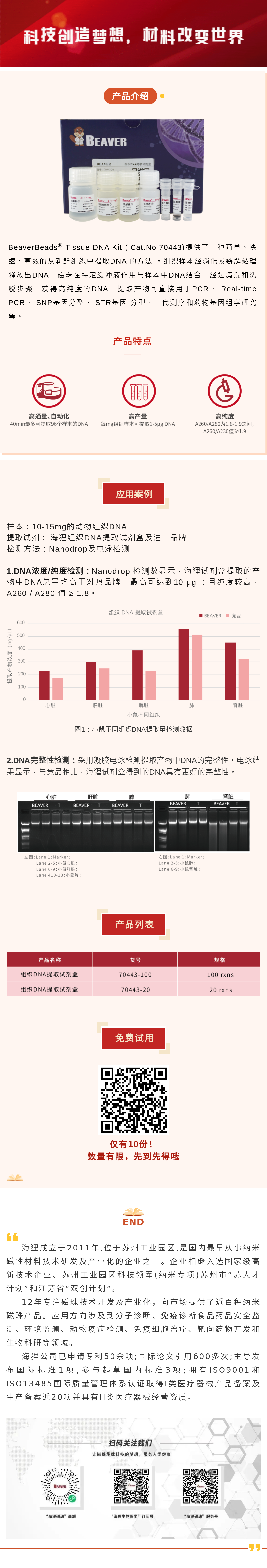 BeaverBeads® Tissue DNA Kit(Cat.No 70443)提供了一种简单、快速、高效的从新鲜组织中提取DNA 的方法 。