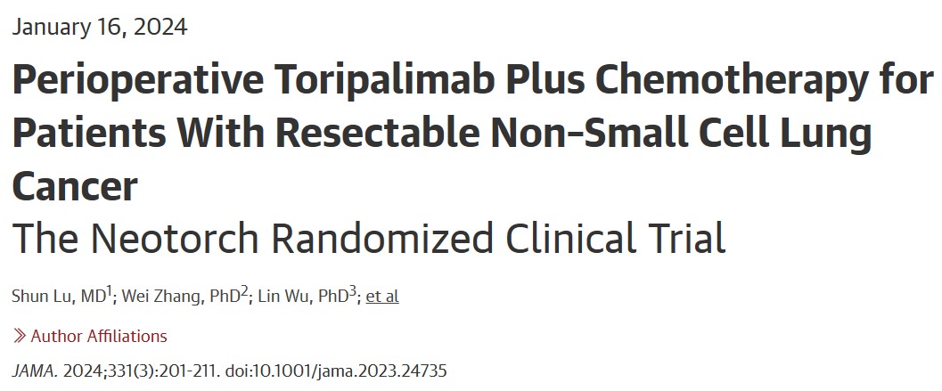 2024年1月16日,上海交通大学陆舜团队在国际知名医学期刊《JAMA》(IF=121)在线发表题为“Perioperative Toripalimab Plus Chemotherapy for Patients With Resectable Non–Small Cell Lung Cancer,The Neotorch Randomized Clinical Trial”的研究论文,NEOTORCH 是一项随机、双盲、安慰剂对照的 3 期试验,旨在评估特瑞普利单抗联合围手术期铂类化疗与单独化疗治疗可切除的 II 期或 III 期 NSCLC 患者的疗效和安全性。结果表明,在围手术期化疗中加入特瑞普利单抗(toripalimab)可显著改善可切除的III期NSCLC患者的无事件生存期,并且该治疗策略具有可控的安全性。