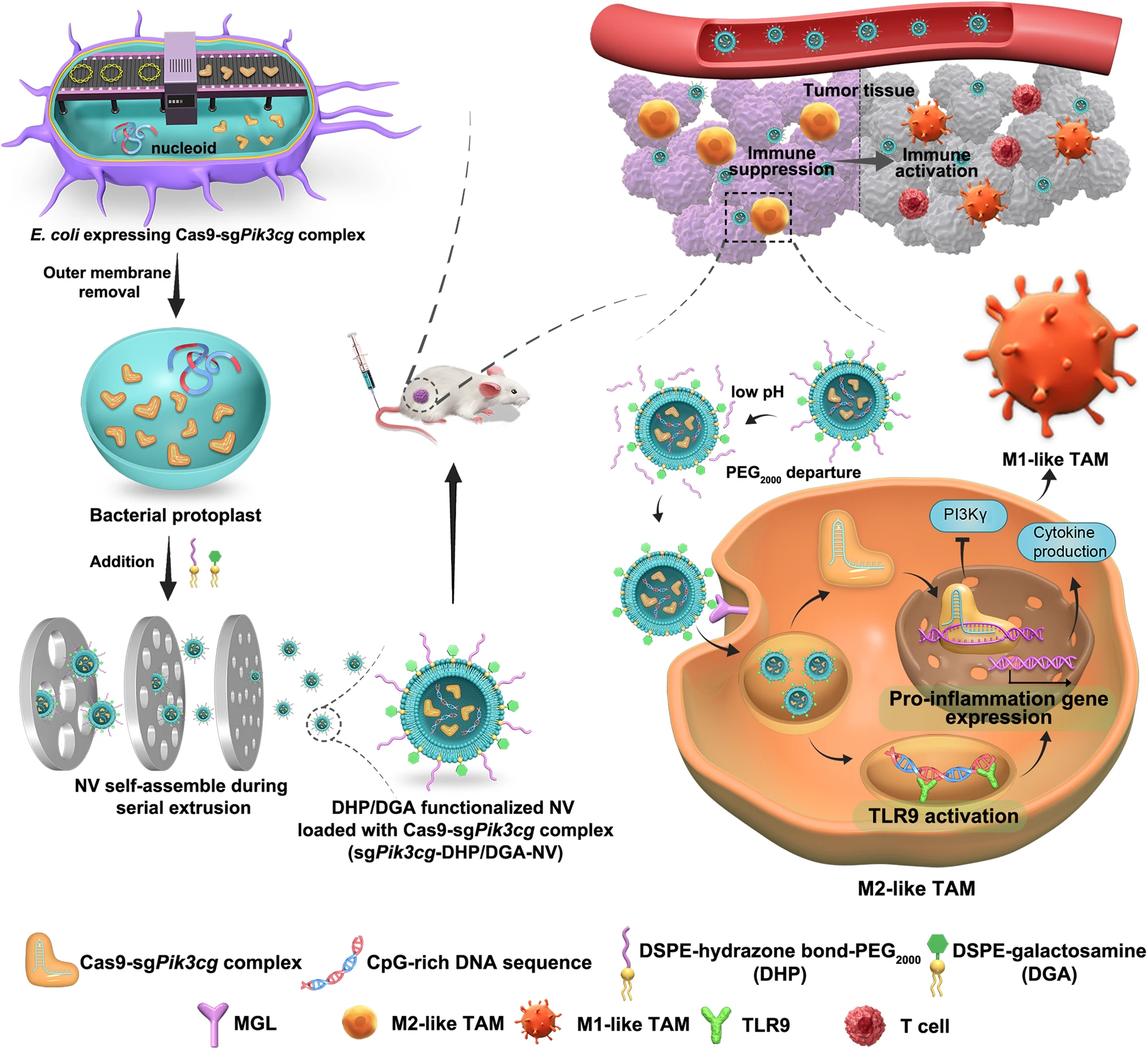 本研究开发了一种靶向肿瘤相关巨噬细胞(TAMs)的体内CRISPR-Cas9系统。研究人员使用了细菌原生质体衍生的纳米囊泡(NVs),这些纳米囊泡由ph响应性PEG共轭磷脂衍生物和针对TAM靶向定制的半乳糖胺共轭磷脂衍生物修饰。利用质粒转化的大肠杆菌原生质体作为生产平台,研究人员成功地在NVs上装载了两个关键成分:靶向Pik3cg的Cas9-sgRNA核糖核蛋白,巨噬细胞极化的关键分子开关,以及富含CPG的细菌DNA片段,作为有效的TLR9配体。这种自组装方法有望用于可扩展的临床生产。策略是通过稳定TAMs中的M1表型来重塑肿瘤微环境,从而抑制雌性小鼠的肿瘤生长。这种体内CRISPR-Cas9技术为癌症免疫治疗开辟了道路,克服了与细胞活力和安全、精确的体内递送相关的挑战。