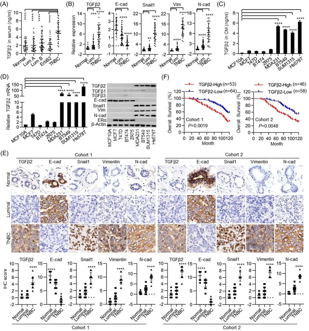 在本研究中,研究人员发现TGFβ2是在体外和体内TNBC细胞系和肿瘤样本中过表达的主要亚型。它的表达是维持在TNBC中观察到的间充质性状和侵袭性行为所必需的。这种 TGFβ2/Smad 信号通路增加了 Snail1 的表达,Snail1 与 zeste 同源物-2 (EZH2) 的增强子相互作用并募集,以沉默特定微小RNA(miRNA)miRNAsTGFβ2(包含miR-145、miR-200a和miR-141)的表达,这是一种主要的内源性TGFβ2抑制剂。这种 TGFβ2/Smad-Snail1/EZH2-miRNATGFβ2型前馈环路仅在 TNBC 中运行,而不在管腔亚型 BC 中运行,因为 ERα 通过与 Smad 相互作用并阻断管腔 BC 中的 Snail1 表达来中断该环路。